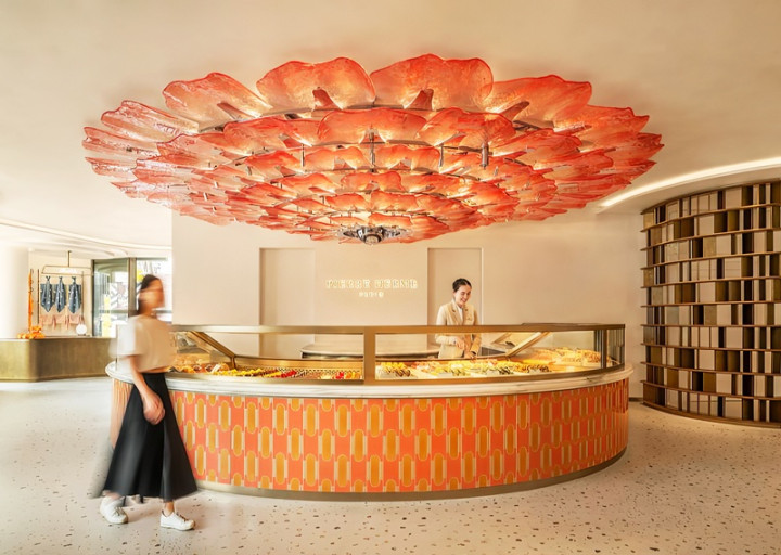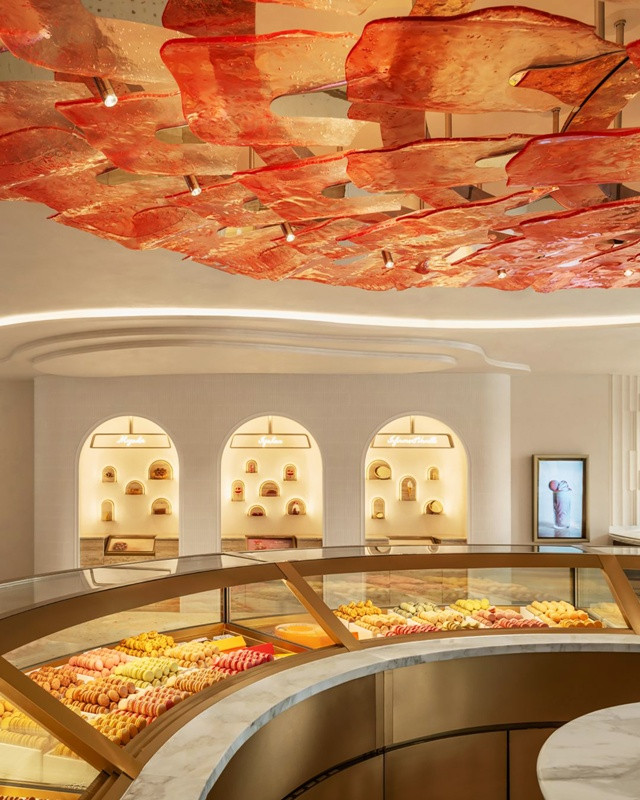 室内仿佛跻身于甜点的柔嫩内馅。温润的木色奠定千里静基调,好比刚出炉的酥皮。店铺中央,一盏由数十片橘红色玻璃花瓣构成的巨型吊灯,宛若盛放的热带花朵,亦似由糖片堆叠而成,投射随和光晕,成为空间的利弊中枢。下方圆形中岛以马卡龙几何语汇呈现,展示品牌最具代表性的甜点。