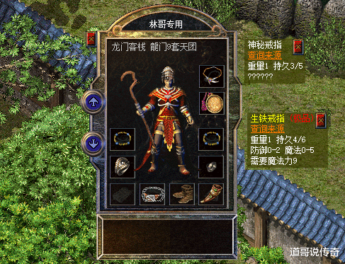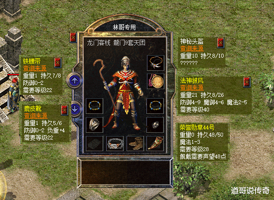 第二,高端衣饰搭配如上图所示,这位大法师的衣饰线索也不赖:法神披风和44号荣誉勋章齐是巅峰级别;铁腰带和鹿皮靴是次顶级系列,看来青铜腰带和紫绸靴还是太特殊了。至于那微妙头盔应该是高魔为主的加点,揣摸也得是3点魔法起步。