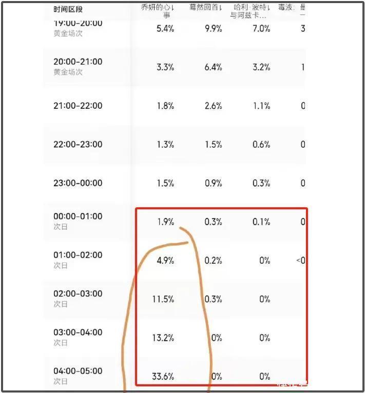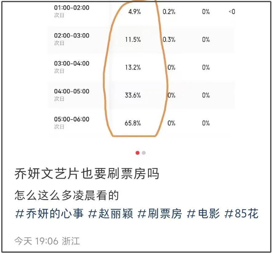 有网友发现,《乔妍的苦衷》票房增长数据特别,果然在凌晨一齐飙升——凌晨1点增长4.9%,凌晨2点增长11.5%,凌晨3点增长13.2%,凌晨4点增长33.6%,凌晨5点增长65.8%,从天黑上升到天亮,越涨越夸张。