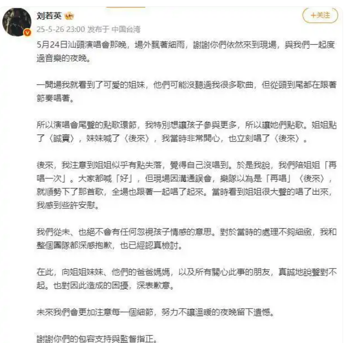 5 月 26 日半夜,勤劳了一天的东谈主们大多已参加梦幻,刘若英却还未休息,她在应答媒体上提防地发出了谈歉声明。她详备阐明了事情的过程,说我方打心底里从来莫得思过要淡薄孩子的情感,正本是衷心实酷爱和姐姐再唱一次,只能惜现场疏通出了岔子,才导致了这么令东谈主缺憾的成果。同期,刘若英职责室也发布了致歉声明,向姐妹俩致以最诚笃的歉意。